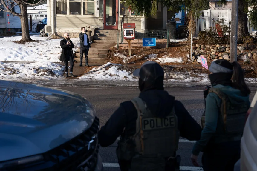 Community members film with their phones from across the street on January 13, 2026, as federal agents conduct an immigration raid days after an ICE agent fatally shot Renee Nicole Good in Minneapolis.