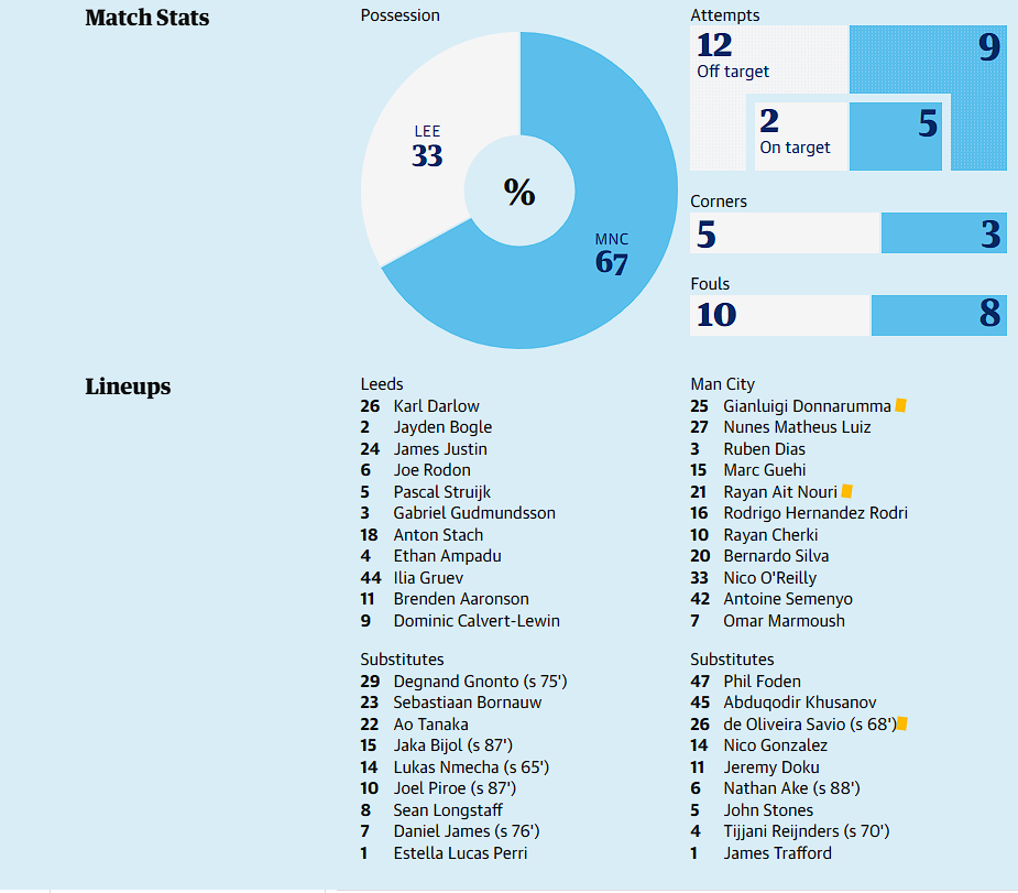 It was the briefest moment of concern from Leeds, who knew they needed to re-energise, sending on Daniel James and Wilfried Gnonto with a quarter of an hour to go. The changes lifted the team and the crowd. City spent spells backed into a corner but showed plenty of fight as they battled to maintain their slender lead. Guéhi and Rúben Dias put their bodies on the line to head and block the ball as they endured adversity to achieve glory.