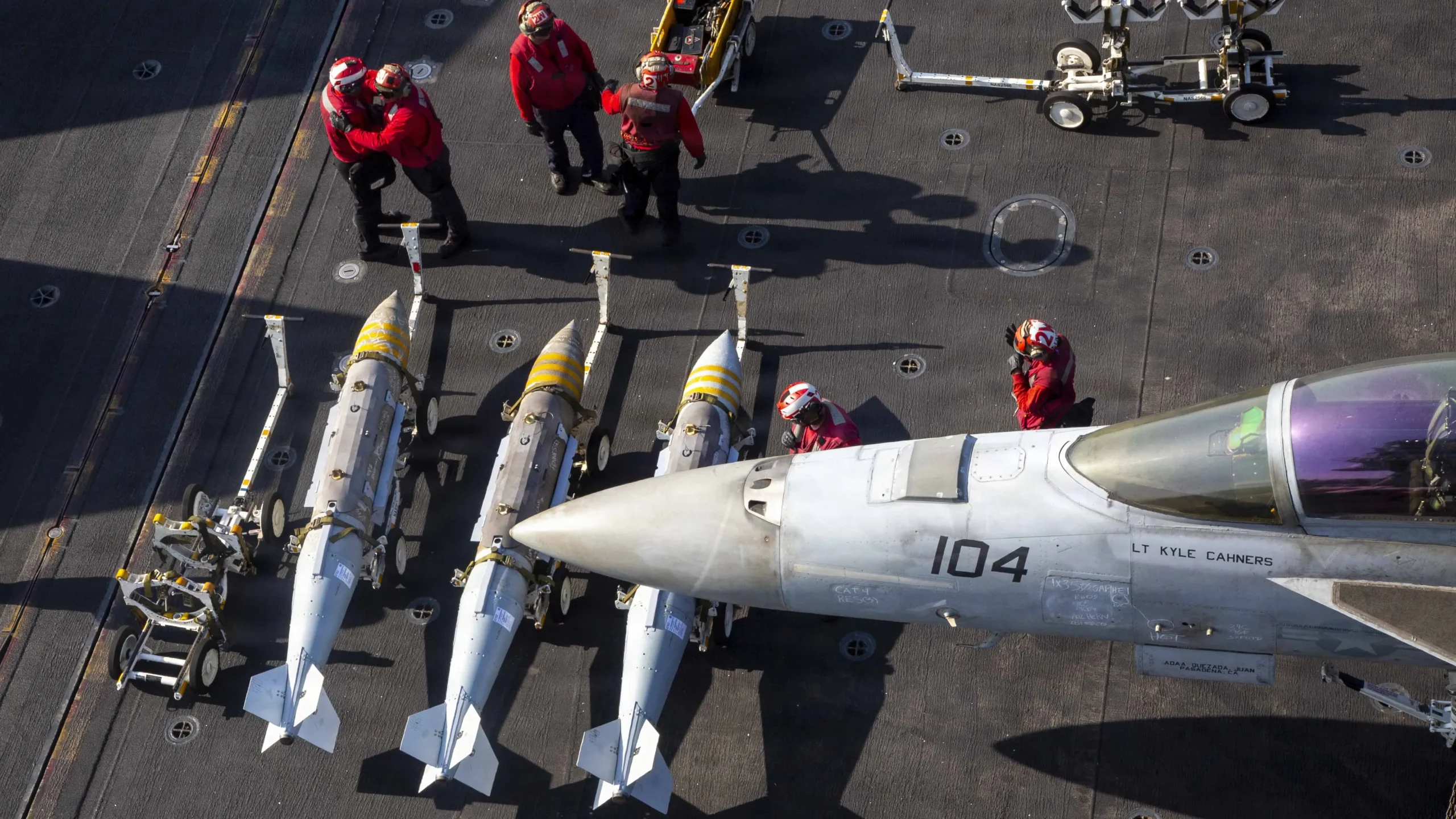 The photos show ordnances — which appear to be GBU-31s, a 2,000-pound class Joint Direct Attack Munition — being staged on Feb. 28 by red-vested aviation ordnancemen prior to being loaded onto strike fighter aircraft in support of Operation Epic Fury, according to CENTCOM photos.