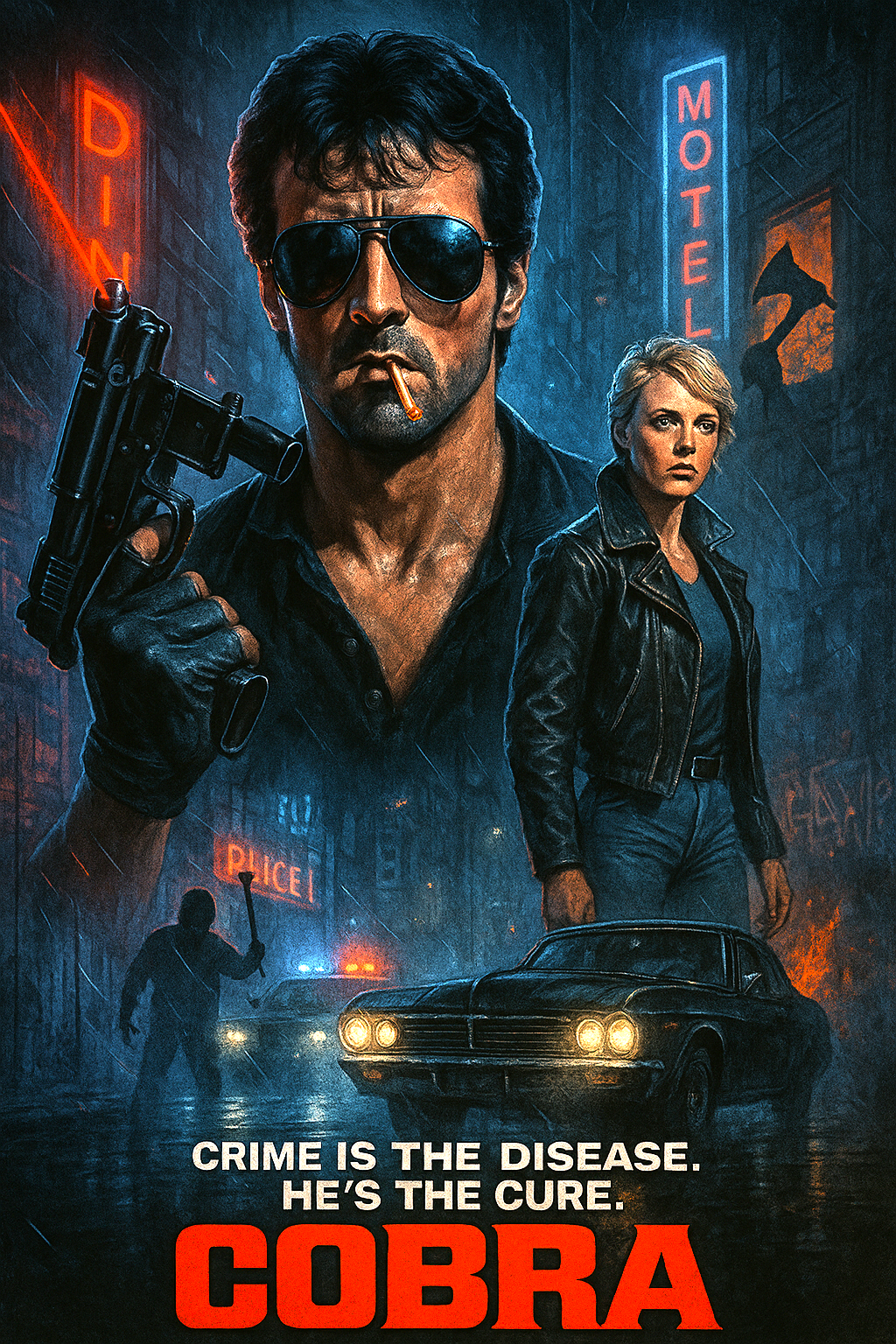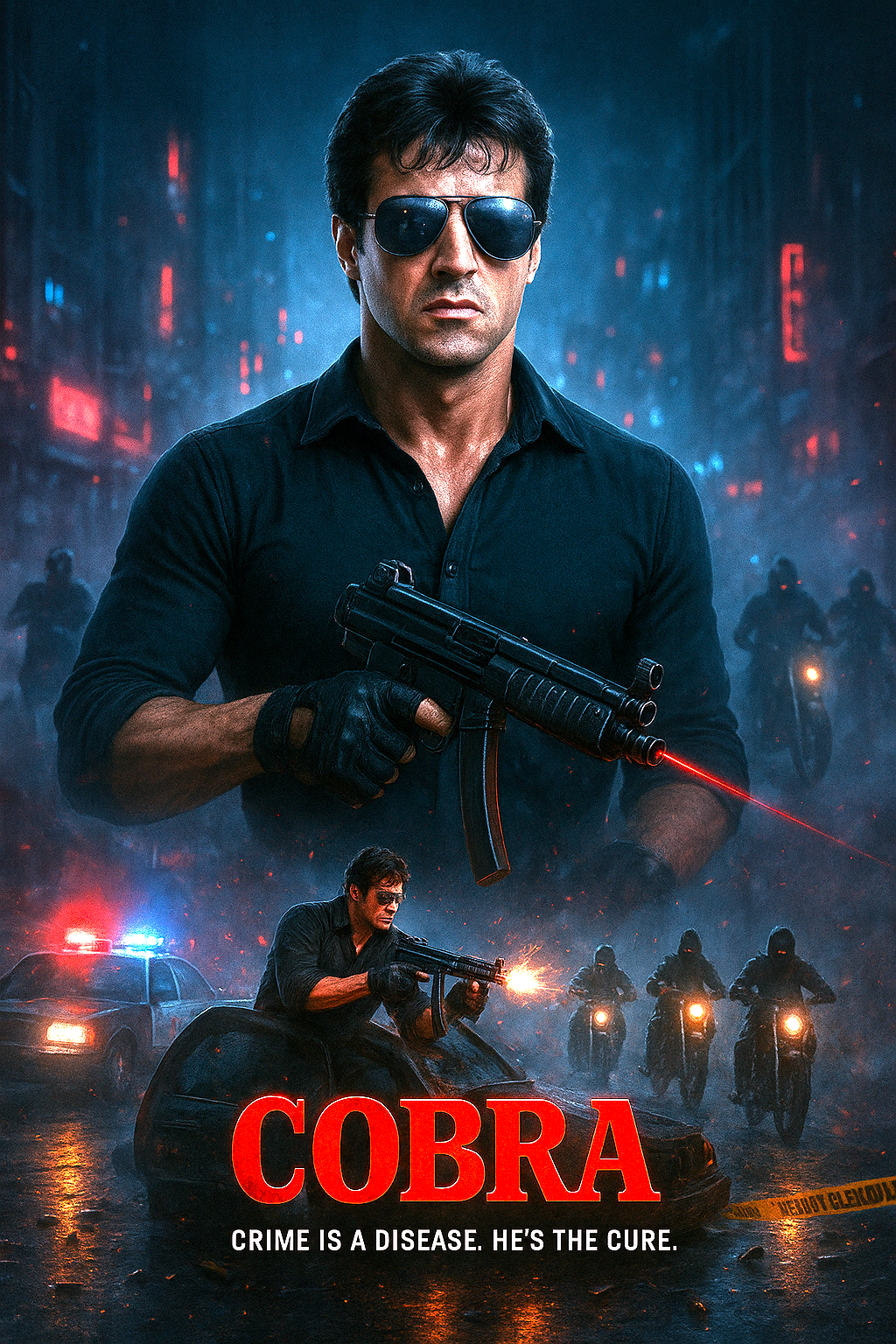 Cobra follows Lt. Marion “Cobra” Cobretti, a hard-edged LAPD officer who specializes in handling the city’s most violent criminals. When a brutal cult known as the “Night Slasher” begins terrorizing Los Angeles, Cobra is assigned to protect Ingrid, the sole eyewitness who can identify the killers. The film embraces 80s action grit—sleek cars, moody neon visuals, and a no-nonsense hero taking justice into his own hands.