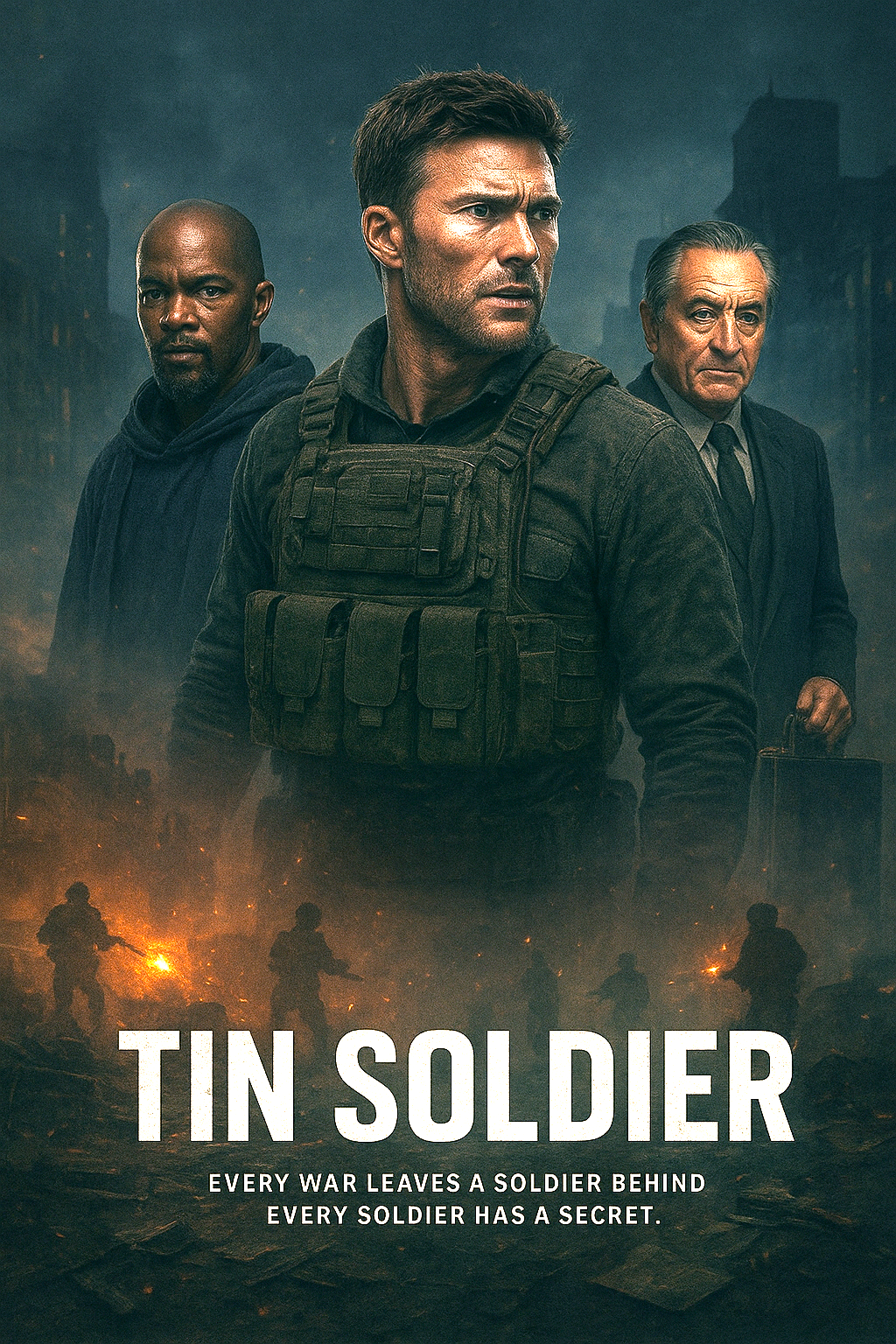 Tin Soldier is a tense action-thriller about Nash Cavanaugh (Scott Eastwood), a former soldier whoβs recruited to infiltrate a dangerous cult led by Leon βThe Bokushiβ Prudhomme (Jamie Foxx). The cult is made up of ex-veterans suffering from trauma, and its charismatic leader preaches a twisted version of salvation. Government agent Ashburn (Robert De Niro) sends Nash in on a secret mission: to gain the Bokushiβs trust, uncover the cultβs true motives, and find Nashβs missing wife. But as Nash dives deeper, he must confront his own painful past and the cultβs growing influence.